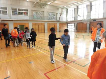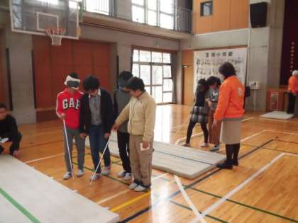 体育館では二人一組となり、一人が目の不自由な人、もう一人が補助する人の役となって実際に歩く体験をしました。目の見えない人の気持ち、補助の仕方など、両方の立場で気づくことがたくさんありました。点字体験では、所定の道具を使い、点字表を見ながら実際に文字を打ちました。