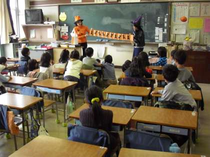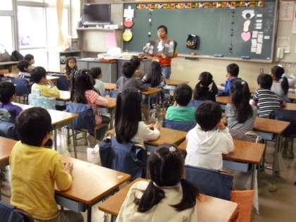 今日の学びタイムに、1年生は英語活動を、英語ボランティアの方と一緒に行いました。ハローウィンが近いので、内容も楽しいものでした。