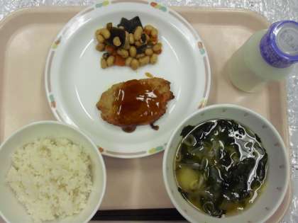 今日のメニューは、麦ごはん、鶏れんこんつくね、こんぶまめ、味噌汁、牛乳でした。