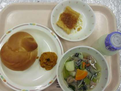 ミルクパン、いかのバーベキューソース、野菜のスープ、スイートパンプキン、牛乳でした。10月も美味しい給食でした。