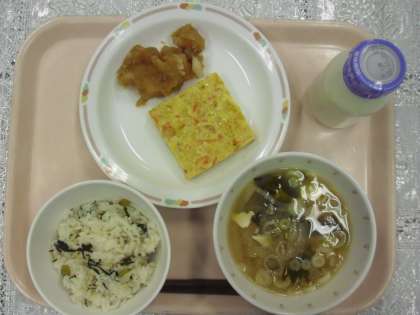 今日のメニューは、菜めし、五目卵焼き、ジャガイモの甘辛煮、味噌汁、牛乳でした。11月になりました。寒くなります。風邪をひかないようにバランス良く食事をしましょう。