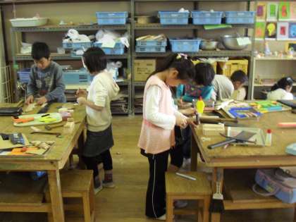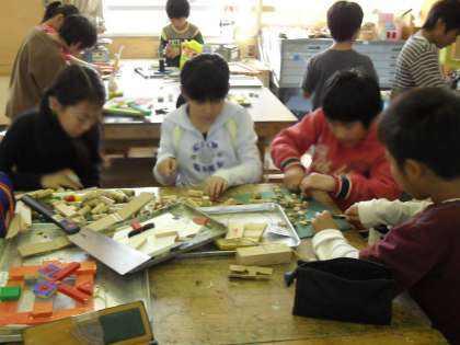 木工を行っています。カナヅチやのこぎりなど、使うことが初めての子どもが多く、1つ1つ丁寧に指導しています。子どもたちも工夫して作成していました。