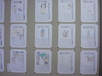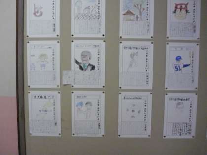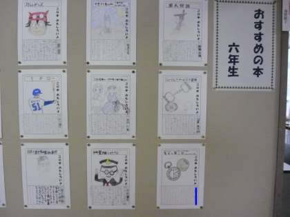 職員室前の掲示板に6年生の子どもたちのお薦めの本の紹介が掲示されています。一人一人が読み、紹介したいと思った本について、絵と紹介文を入れて作成しています。読みたくなるようなコメントが書かれいます。ご来校の際は、ご覧ください。