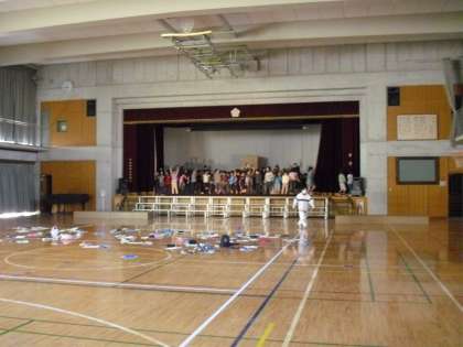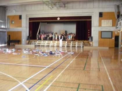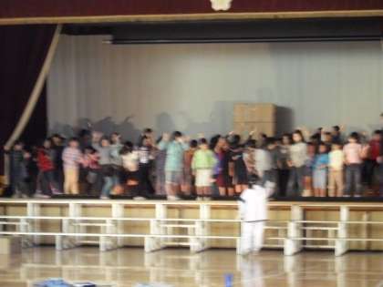 発声練習の後に、いよいよ玉堤物語の練習です。声の大きさを考えて、一生懸命に練習しました。