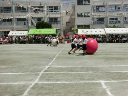 2年生のコロコロ転がれ大作戦、相手チームだけでなく、大玉にも負けないよう頑張りました。