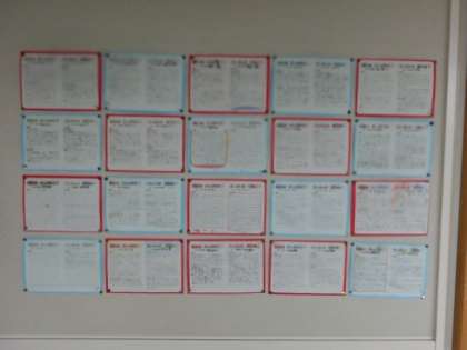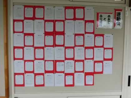 運動会が終わって、10日ほどたちました。子どもたちは、学年に応じて自分のめあてに対する振り返りを文や絵を用いて表しています。