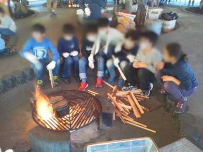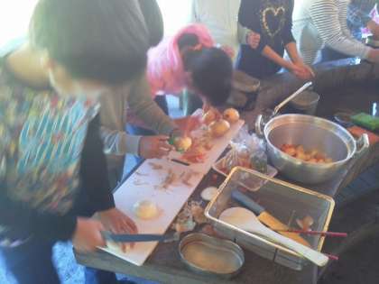 それぞれの係の仕事を頑張り、カレー作りが進んでいます。学校での家庭科の学習でみんなで作った経験も活かされています。