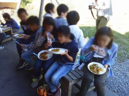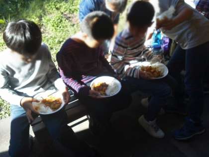 晩御飯には早いけれど、美味しいカレーをいただいています。お友達と作ったカレーは、やはりひと味違います。(16:15ころ)