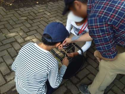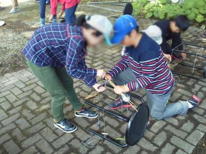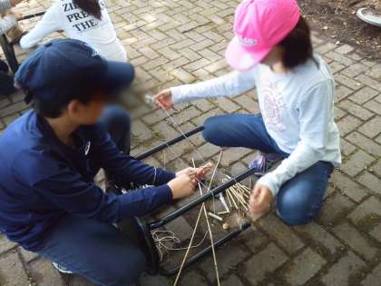 こちらは、コースター作りです。2人一組で息を合わせて作業を進めなければ、上手にコースターを作ることができません。1人ずつ交代で作ります。