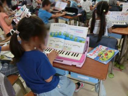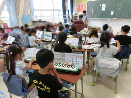 音楽の学習で、鍵盤ハーモニカの練習をしたり、教科書の挿絵からカエルの声を想像したりしました。
