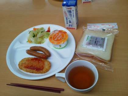 みんな元気に朝ご飯をいただいています。今朝のメニューは、食パン、イチゴジャム、ソーセージ、ハッシュドポテト、コールスローサラダ、みかんゼリー、牛乳です。