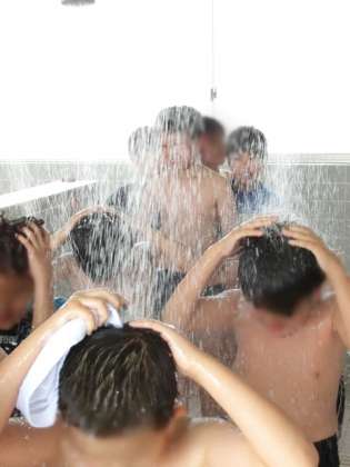 代表のお友達が今年度の目標を発表し、担任の先生方から安全に学習するための約束事のお話をしていただいた後、「天国?のシャワー」を浴びました。
