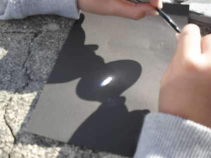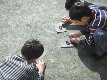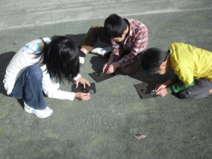 秋の日差しを受け、3年生は理科の学習でレンズの働きの学習を行いました。レンズで太陽の光を集め、黒い紙を焦がせるか一人一人行っていました。上手くできる人と集めるのに苦労する人といましたが、互いに教え合って行うことができました。レンズの不思議と太陽の力が分かったようです。
