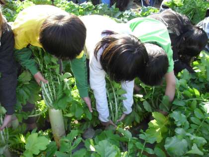 毎年支援をいただいている、農家の方の畑で、種の植え方を教わり途中の成長を見守り、育てていた3年生の「大根」が、大きく成長したので今日、3年生のみんなで収穫をしました。大きく育った大根は、1本4キロ以上あるものもあり、抜くのにとても苦労していました。一人2本の大根、持ち帰る子どもたちは、歓声をあげながらも抱えていました。落とさないで、無事に家に帰ることを祈っています。