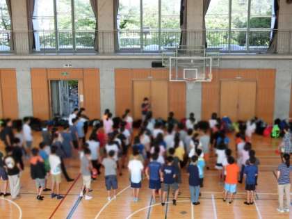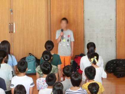 まずは、出発式です。予定より少し遅れて開始しました。校長先生のお話や代表のお友達の言葉、引率の先生方の紹介、そして予定の確認をしました。