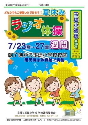 明日23日(月)から27日(金)までは、玉堤小コミュニティー主催で、毎年恒例のラジオ体操を7時から玉堤の校庭で行います。