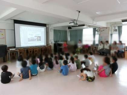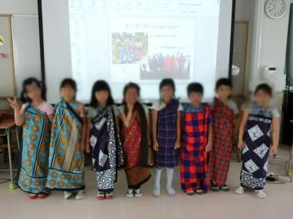 ケニア大使館にお勤めの経験を持つ地域の方とそのお友達がいらしてくださり、あいさつやそのほかの言葉、小学校のこと、生活のことなどを教えてくださいました。ケニア式の拍手やケニアの歌で盛り上がりました。さらにみんなは、ケニアの衣装も身に付けました。カラフルな衣装に大喜びで、ファッションショーを行いました。