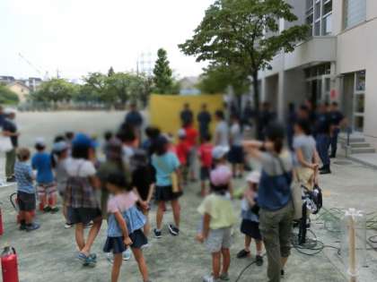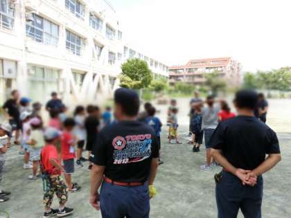 毎年恒例のおやじの会主催の夏休みイベントです。今回は、校庭や体育館を使い、前半は、消防署や、消防団、世田谷区の防災担当の方々のご指導で、放水訓練、消火器、起震車、人の運び方などの訓練を受けました。