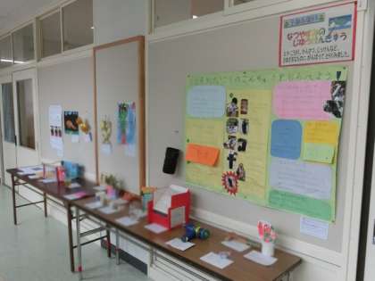 写真は、1年生の自由研究の展示、2年生の係決め、3年生の自由研究の発表です。