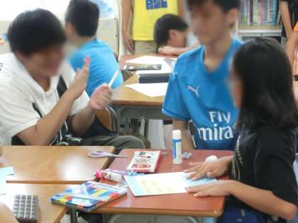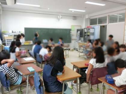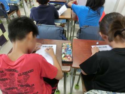 写真は、4年生の係決め、5年生の2学期の目標、6年生の係のポスター作りの様子です。