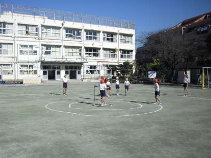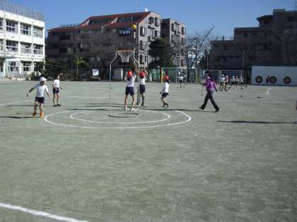 バスケット型のボールゲームを行っています。コートの中央にゴールを置き、攻撃側と守備側とに分かれて、対戦します。シュートの感覚やパスの仕方が段々と上手になり、作戦も考えて進めています。5年生のバスケットボールにつながる学習です。