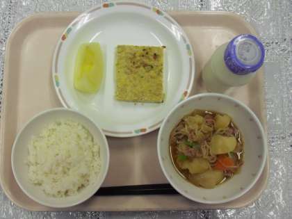 今日のメニューは、麦ご飯、切干大根入り卵焼き、肉じゃが、リンゴ、牛乳でした。