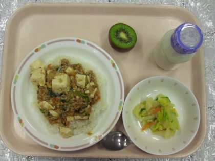 メニューは、麻婆豆腐丼、ラー白菜、キユイフルーツ、牛乳でした。