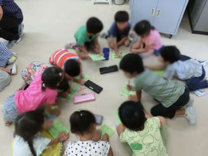 来週の遠足に備えて1・2年生がグループで自己紹介をしたり、遊びを決めたりしていました。2年生がしっかりとリーダーシップを発揮していました。