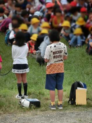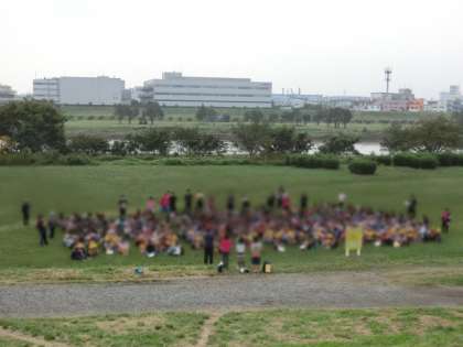 河川敷で全員が集まり、帰校式を行いました。6年生の班長の代表があいさつをしました。