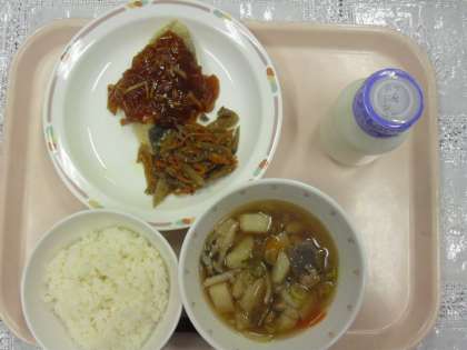 昨日のメニューは、ご飯、鰆の甘酢あん、五目きんぴら、みぞれ汁、牛乳でした。