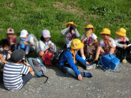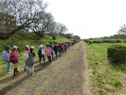 多摩川の河原を約1時間歩くので、途中で1回休憩しました。子どもたちからは、歌声も聞こえてきました。