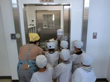 さっそく、1年生が給食室に給食のワゴンを取りに行きました。「よろしくお願いします。」