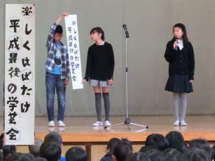 代表委員会から、学芸会のスローガンを発表しました。3年生以上から募集したものの中から決めました。「楽しくはばたけ 平成最後の学芸会」