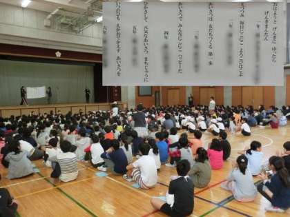 そして、最後に、生活指導の先生から、全学年の中の希望者が応募した「あいさつ標語」の代表に選ばれた作品を発表しました。各学年1点です。代表作品は、西門付近に掲示します。また、応募された全部の標語は、3階学習室の前に掲示します。みんなで気持ち良いあいさつを交わすようにします。