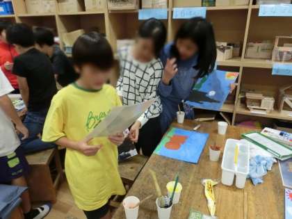 学習の途中で、子どもたちは互いの作品を見て、良いところを見付け伝え合うことでさらに表現を広げていました。