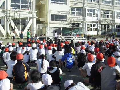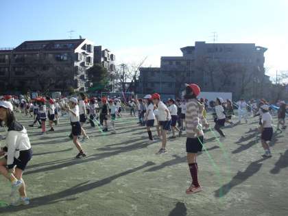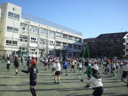 短縄を始めました。いろいろな跳び方を運動委員会の児童が見せた後、一人一人始めました。これから2月中挑戦します。