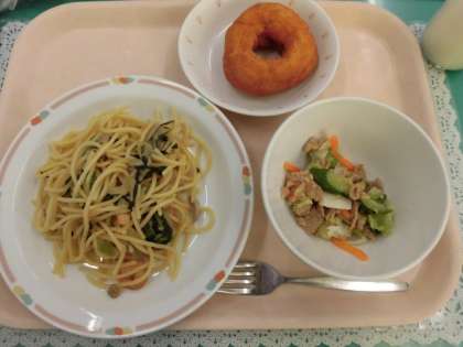今日は学芸会特別メニュー6年生「新・魔王の谷から歌がきこえる」からでした。魔物たちが大好きな人間のエネルギーがつまったスタミナサラダと、心を一つにし、みんなで力を合わせて魔物をたおせるようにみんなの輪◎ドーナツを出しました。