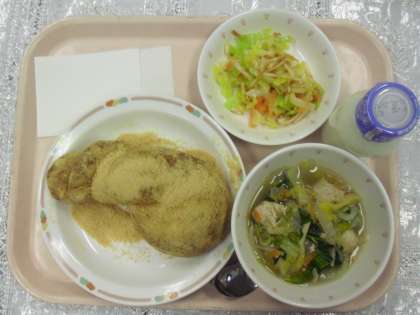 今日のメニューは、お楽しみでした。委員会の子どもたちがアンケートを取り、決定しました。揚げパン、肉団子スープ、サラダでした。