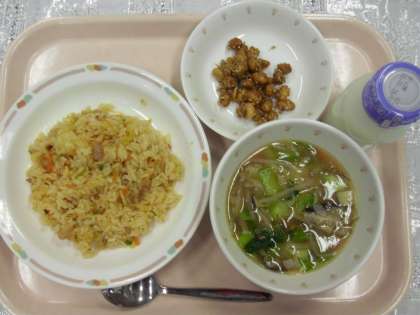 今日のメニューは、キムチチャーハン、ワンタンスープ、大豆とじゃこの甘辛揚げ、牛乳でした。