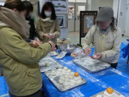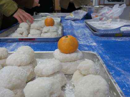 子どもたちが作った小さい鏡餅を、お母さんたちやコミュニティーの方が仕上げてくださっています。たくさんできました。どこに飾りましょうか。