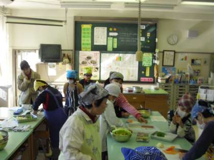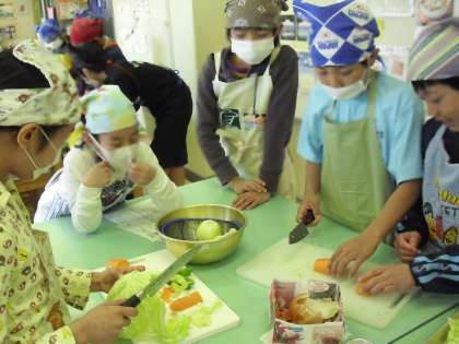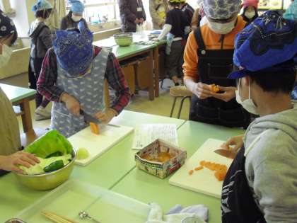 川場のカレー作りを思い出して、5年生は調理実習で、野菜炒めを作りました。でも包丁を持つ手は?なんとなく