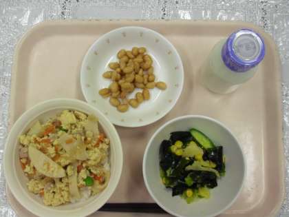 今日のメニューは、親子丼、ぶどう豆、ワカメサラダ、牛乳でした。