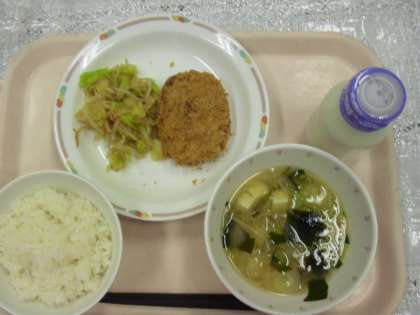 今日のメニューは、ご飯、肉じゃがコロッケ、キャベツのおかかあえ、味噌汁、牛乳でした。