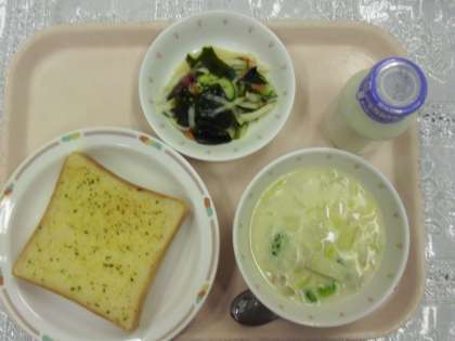 昨日のメニューは、ガーリックトースト、白菜のシチュー、海藻サラダ、牛乳でした。