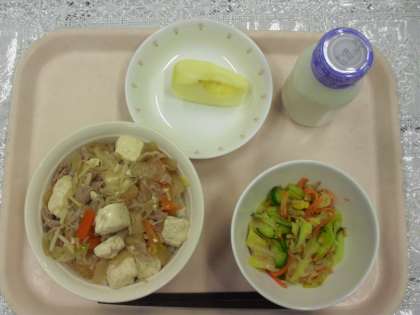 今日のメニューは、肉豆腐丼、ごぼうチップサラダ、りんご、牛乳でした。