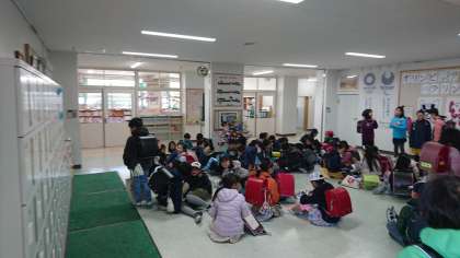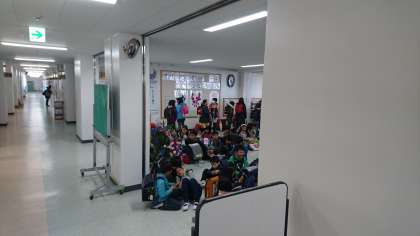 今週は集団登校をしています。いつものように、時間が来るまでクラスごとに並んで待っています。(4月11日)