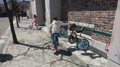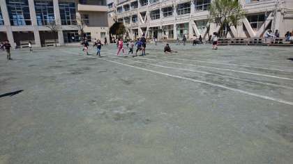 広い校庭で一輪車を練習している子どももいれば、この時期は校庭にコースが引いてあるために走る練習している子どももいいました。(4月11日)