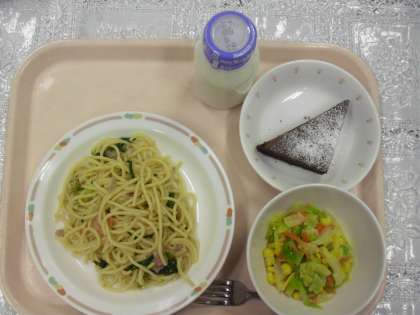 小松菜とベーコンのスパゲッティ、コーンサラダ、チョコレートケイキ、牛乳でした。
