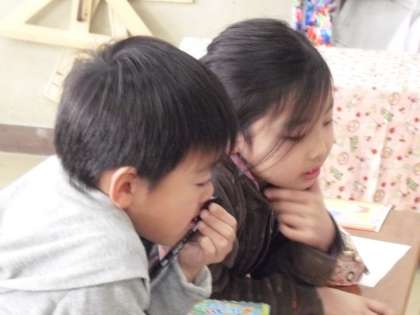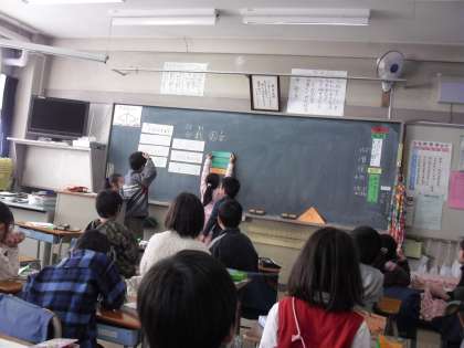 折り紙を使って、2年生が分数の学習をしました。折って広げて、同じ大きさの形がいくつできたから と何分の1と答えていました。操作活動を取り入れて学んでいました。
