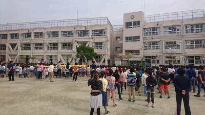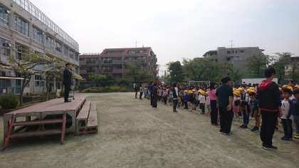 新学期初めての朝会が行われました。みんなしっかりと話を聞くことができました。(4月22日)